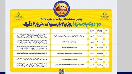با توجه به اهمیت سلامت دهان و دندان در حفظ سلامت عمومی و نقش مؤثر آن در پیشگیری از بیماریها، پویش ملی سلامت دهان و دندان با شعار: «دو، دو تا یادت نره! روزی دو بار مسواک، هر بار دو دقیقه» از شنبه ۱۹ مهرماه تا پنجشنبه ۲۴ مهرماه ۱۴۰۴ به مدت یک هفته، با مشارکت وزارت بهداشت، درمان و آموزش پزشکی و وزارت آموزش و پرورش برگزار میشود.